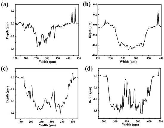 Wear profile curves of films with various target powers: (a) 4 kW, (b) 8 kW, (c) 12 kW, and (d) 16 kW.