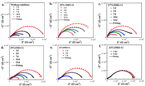Nyquist plots of artificial scratched gel coating with various contents of IMO-11 inhibitor immersed in test solution for different periods: (a) without; (b) 25%; (c) 27%; (d) 29%; (e) 31%; (f) 33%.