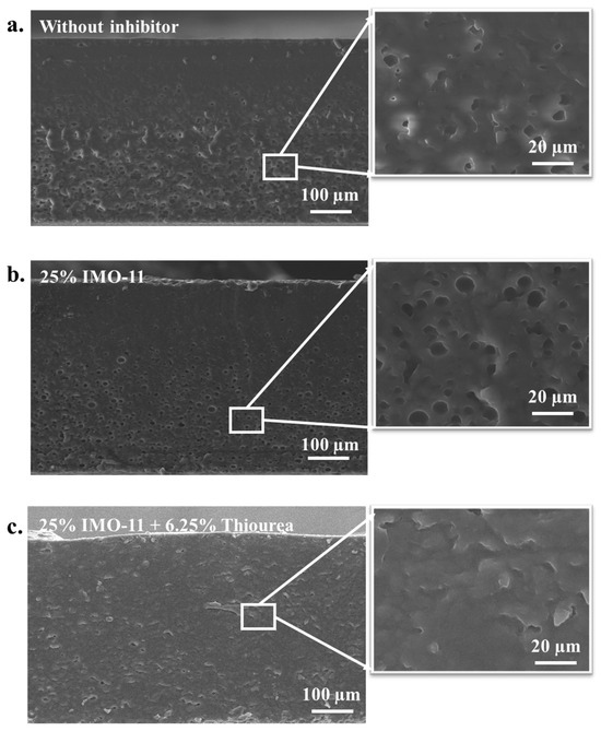 According to the EIS results of scratched gel coating with various inhibitor contents, the fast release of the inhibitor in an aqueous corrosion medium would lead to a decrease in adhesive force and shorten the service time. To avoid the influence of corrosion inhibitors in the gel coating, the following research was carried out for the gel coating with a 25% IMO-11 inhibitor. Based on the formulation of gel coating with a 25% inhibitor, thiourea and sodium oleate were added to the gel coating, to further investigate the synergistic effect of inhibitors on gel coating. Figure 4 shows the cross-section of the gel coating with different ratios of hybrid inhibitors. And the gel coating without inhibitor and with a 25% IMO-11 inhibitor are also presented.