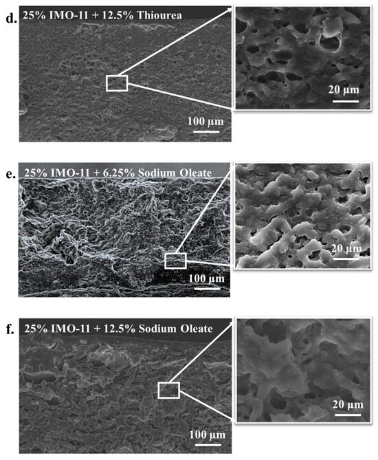 There are several “honeycomb”-shaped cavities in the coating’s cross-section for the inhibitor-free coating (Figure 4a). The gel coating without inhibitor is formed by the ethyl-cellulose skeleton structure and the dispersed phase of the small-molecule oily substance (castor oil in this research). The cavities are the dispersed phase in the gel coating, which lead to the gel coating being able to hold a higher content of the inhibitor and have an effect on the filming performance and anti-corrosion performance of the coating [7,8,9,10]. After adding inhibitors to the gel coating (Figure 4b–f), the main structural features have not significantly changed. Only the size and density of cavities have changed. For the coating with inhibitor, the inhibitors and castor oil both act as dispersed phases in the gel structure. Parts of the inhibitor would have a cross-linking reaction with the ethyl-cellulose skeleton structure, which would enhance the stability of the gel coating and lead to improvement in the anti-corrosion performance. The remaining inhibitor components are evenly distributed throughout the gel coating as a free dispersion phase. Once the coating is damaged, the free inhibitor could rapidly release into the corrosion medium and form an anti-corrosion adsorption film on the metal substrate. And the high content of inhibitor could lead to the continuous release of the inhibitor from the coating to provide a longer corrosion protection effect [26,27]. In addition, according to results of this section, the hybrid inhibitor of IMO-11 with thiourea or sodium oleate has no obvious difference.