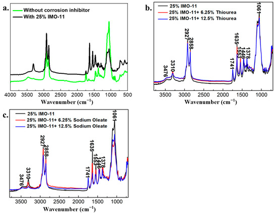 FT-IR spectra of gel coating without and with different inhibitors; (a) without and with 25% IMO-11; (b) with IMO-11 and thiourea; (c) with IMO-11 and sodium oleate.