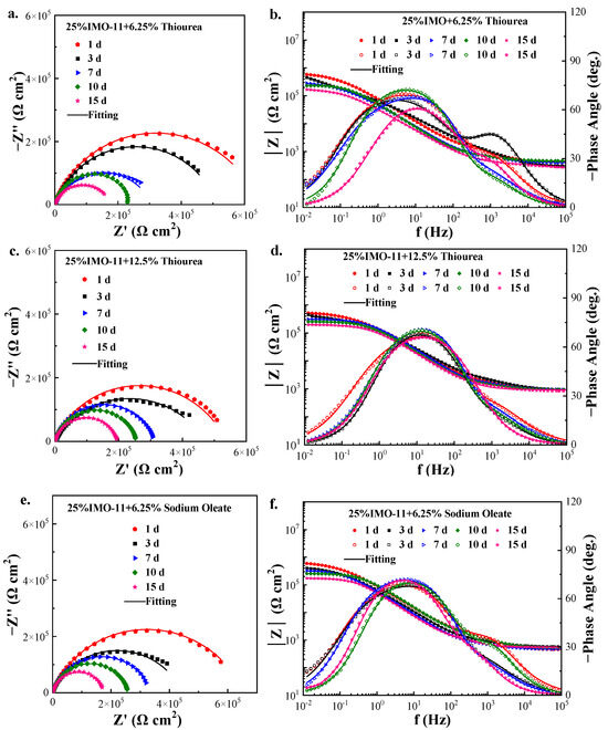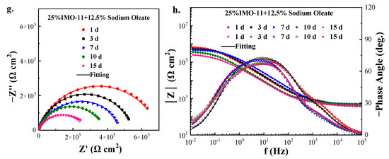 In our previous study [10], synthesized imidazoline inhibitors with different length carbon chains were pre-loaded into the ethyl-cellulose gel coating. The enhanced effect of inhibitors on anti-corrosion performance and self-healing effect has been proven. To further investigate the effect of inhibitor content on gel coating corrosion protection, a series ethyl-cellulose gel coatings with various IMO-11 inhibitors was prepared on Q235 carbon steel. A 10 mm artificial scratch penetrating the steel was made on the coating sample. Figure 2 displays the electrochemical impedance spectroscopy (EIS) results of prepared samples that were submerged in a 3.5 weight percent NaCl solution with saturated CO2 for different periods of time. The EIS test was measured on the 1st, 3rd, 7th, 10th, and 15th days to investigate the anti-corrosion performance of coatings.