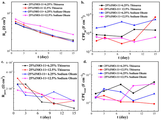 Electrochemical parameters fitted from the EIS results. (a) Rct; (b) CPEdl; (c) Rpore; (d) CPEcoat.