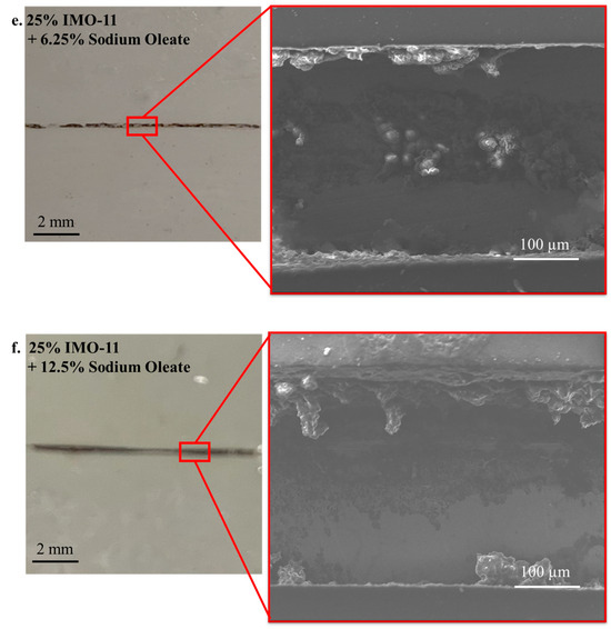 The optical microscope and SEM were employed to observe the corrosion morphology of the scratched area of the gel coating with various inhibitors after 15 days of immersion. And the surface morphology of the immersed gel coating without inhibitor was observed. Numerous corrosion products are present at the scratched area of the gel coating without inhibitor, as seen in Figure 9a. The corrosion would occur at the damaged area of the coating and lead to the failure of the coating. For the coating with 25% IMO-11 (Figure 9b), the corrosion at the scratched area was significantly reduced due to the self-healing effect of the gel coating. The inhibitor released from the coating would form an adsorption film to protect the steel at the scratched area. For the coating with hybrid inhibitors (Figure 9c,d,e,f), almost no corrosion products can be found at the scratched area. These results further confirmed the great self-healing performance and corrosion protection effect of the released inhibitors from the gel coating.