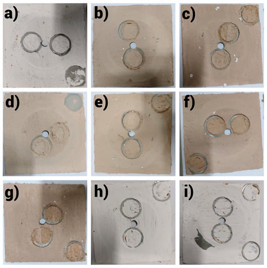 Abrasion test on substrate under different conditions: (a) reference coating; (b) 5% added.; (c) 10% addit.; (d) 15% eq; (e) 35% eq. (f) 65% eq. (g) 90% eq; (h) Firewall 200; (i) Ak 7000.