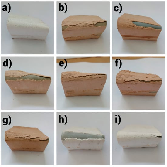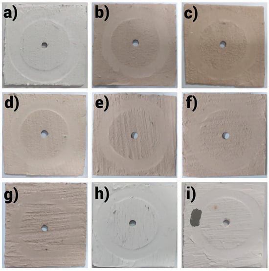 Adherence test on substrate under different conditions: (a) reference coating; (b) 5% addit.; (c) 10% addit.; (d) 15% eq; (e) 35% eq. (f) 65% eq. (g) 90% eq; (h) Firewall 200; (i) Ak 7000.