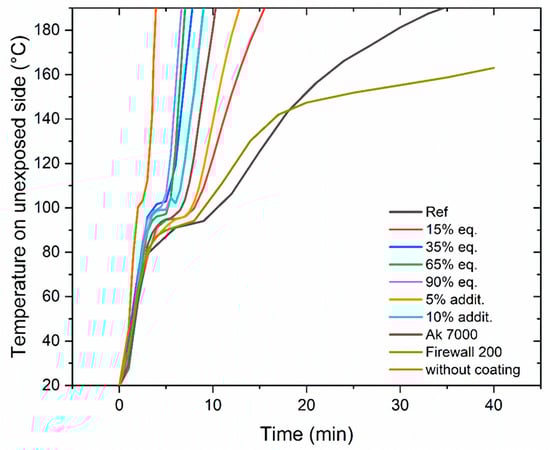 The results associated with fire resistance can be observed in Figure 5. A similar overall behavior is noticeable in all formulations, characterized by a sudden increase in temperature until reaching approximately 95 °C. After reaching this temperature, there is stabilization and plateauing, indicating that the coating has reached the necessary energy to initiate the intumescent reaction and generate the carbonaceous foam that acts as an insulating barrier, releasing cooling gases in its initial stage and reducing heat transfer to the substrate. Subsequently, a change in the heat transfer rate is observed due to the carbonaceous barrier, but with a constant temperature increase rate in all tannin-containing formulations. This temperature increase rate is closely related to the protective quality, which includes the thickness of the carbonaceous layer, its stability, and the area of coverage on the substrate. The best performances in this stage were achieved by the commercial Firewall 200 coating, which reached 40 min without reaching the temperature of 190 °C, and the reference coating, which reached 34.6 min to reach 190 °C. The tannin-containing coating that showed the highest performance in this category was the 15% equivalence compared to the commercial Ak 7000 coating, thus achieving a fire-resistance rating (FRR15). This indicates that formulations with a lower content of low-molecular-weight tannin in their composition exhibit higher fire resistance. These findings suggest that tannins do not have good properties as a charring agent despite their high hydroxyl group content. The reasons explaining this phenomenon from the obtained results are detailed below.
