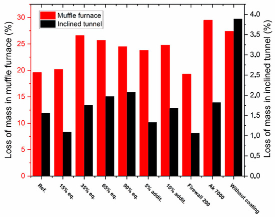In Figure 6, it is concluded that the formulations exhibit remarkable resistance to mass loss under elevated temperature conditions. These values are comparable or even superior to those of the examined commercial coatings, suggesting that intumescent coatings formulated with tannins can maintain their physical integrity and resist decomposition at high temperatures, thus preserving their heat resistance properties. In both tests, the formulation with the lowest mass losses was identified as Firewall 200. This formulation showed values practically identical to the reference formulation, with minimal differences of 0.35% and 0.44% in muffle furnace and inclined tunnel tests, respectively. Additionally, the formulation with 15% tannin equivalence also demonstrated outstanding performance, differing only by 0.96% and 0.03% from the aforementioned formulation. This pattern suggests that weight losses are lower in formulations with low levels of tannin. It should be noted that the uncoated sample experiences mass losses of 27.38% and 3.89% in muffle furnace and inclined tunnel tests, respectively. When comparing the test results, it is observed that the values obtained in the inclined tunnel experiment are significantly lower due to the shorter duration and lower temperature of the experiment. However, these results reflect a similar behavior, showing greater mass preservation in formulations with low levels of tannin. These findings align with the fire resistance values, suggesting that the formulations yielding superior results are the reference formulation and the 15% tannin equivalence formulation.
