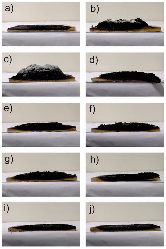 As seen in Figure 7, the highest intumescence height and a more stable carbonaceous reaction surface were primarily observed in the commercial Firewall 200 coating (see Figure 7c). Secondly, the best intumescence reaction was achieved by the reference formulation (see Figure 7b), which reached a height of 19.86 mm, surpassing the commercial Ak 7000 coating by 74.5%. Similarly, a clear relationship can be observed in the tannin-containing formulation described earlier. It can be seen that as the tannin equivalence increases from Figure 7e–j, the intumescence reaction decreases, becoming increasingly similar to the substrate without intumescent coating (see Figure 7a).