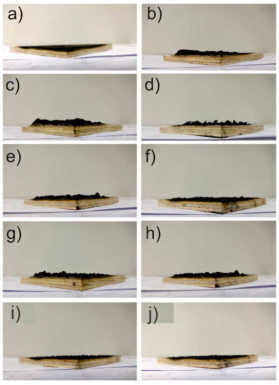 Intumescence height in inclined tunnel test on substrate under different conditions: (a) without coating; (b) reference coating; (c) Firewall 200; (d) Ak 7000; (e) 5% addit.; (f) 10% addit.; (g) 15% eq; (h) 35% eq.; (i) 65% eq.; (j) 90% eq.