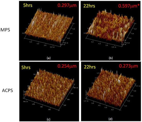 Figure 3 shows the 3D topographical AFM images of MPS- and ACPS-treated silica wafers with immersion times of 5 h and 22 h. The average roughness (Sa) is also shown.