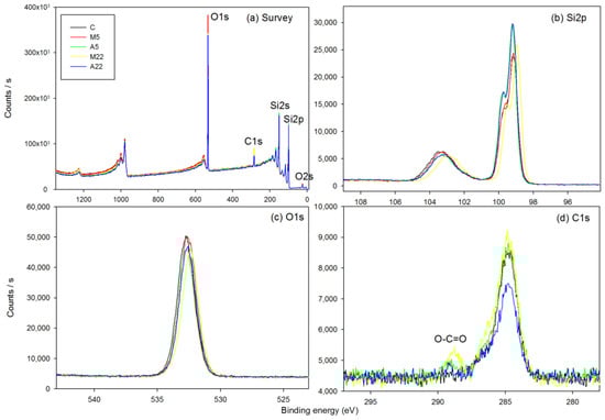 Table 3 displays the elemental compositions of O1s, C1s and Si2p in the control and experimental samples. It can be seen the C1s increases in all silane-coated substrates as well as the coating time. Figure 4 shows the XPS (a) survey scans and high-resolution XPS scans of the (b) Si2p, (c) O1s and (d) C1s of all groups. In particular, in high-resolution scan of the C1s of M22, a prominent peak at 288.5 eV can be observed, which corresponds to O-C*=O in methacrylate.