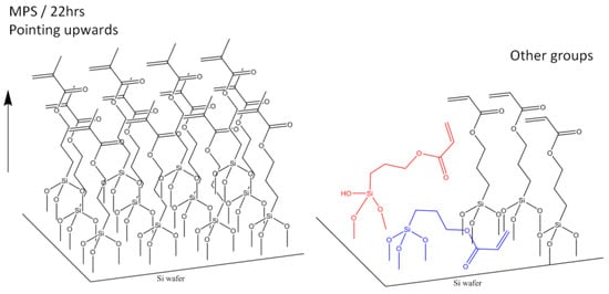 As detected by AFM, the M22 showed a significantly higher surface roughness than the others. This could be due to the formation of mechanically stronger island structures, which is a possible structure of silane monomers aggregated in an orientated order on the surface of the monolayer when the optimal immersion time is achieved, as suggested by the previous literature [37]. Indeed, the high-resolution XPS on C1s (Figure 4d) showed a prominent peak at 288.5 eV, which corresponds to methacrylate O-C*=O [38]. This signal is not conclusively strong in the high-resolution scans of C1s in other groups. So, the M22 has a complete monolayer formation such that the silane layer is oriented fully in the vertical direction, while in other groups, defects occur (Figure 5). Thus, even if the same silane is used, the dipping time would affect the quality of the silane.