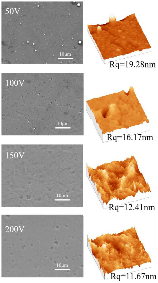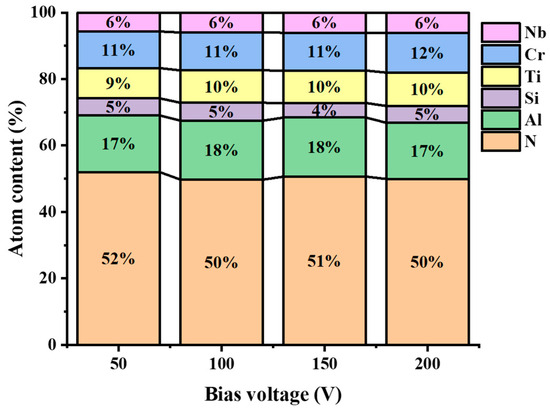 The morphologies of the AlCrNbSiTiN coatings are shown in Figure 1. It can be clearly observed that the particles and holes, as well as the surface roughness, decrease with increasing bias voltage. Specifically, the surface roughness decreases from 19.28 nm to 11.67 nm when the bias voltage increases from 50 V to 200 V. The cross-section morphology of the AlCrNbSiTiN coatings is shown in Figure 2. The thickness of the coatings decreases from 2.56 μm to 1.63 μm with increasing bias voltage. As the bias voltage increases, the kinetic energy of the ions will increase, resulting in an enhanced resputtering effect and hence a denser coating layer [31,32,33,34]. Chemical composition as a function of bias voltage for AlCrNbSiTiN coatings is illustrated in Figure 3. No significant change in the proportion of coating elements could be identified, indicating that bias voltage does not noticeably affect the chemical composition of the coatings.