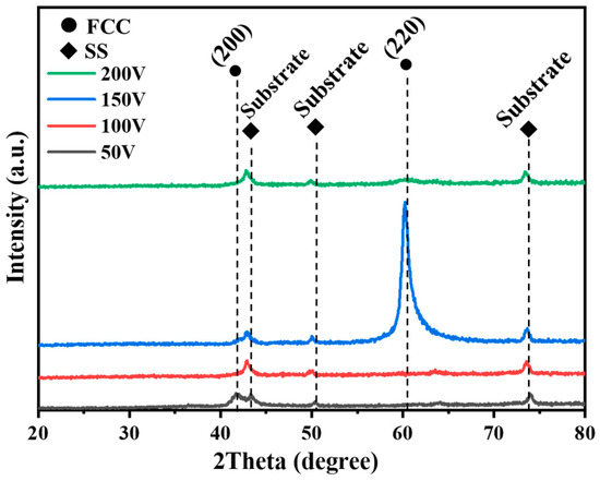 Figure 4 plots the XRD patterns of AlCrNbSiTiN coatings. The powder diffraction file numbers of the AlCrNbSiTiN coatings and SS are 65-2899 and 88-2324, respectively. All coatings are face-centered cubic (FCC) structures. When the bias is 50 V, there are both (200) and (220) diffraction peaks. With increasing bias, the (200) peak gradually disappears, while the diffraction peak of (220) gradually increases. The (220) peak is obviously widened under a 150 V bias, suggesting the refined grain structure of the coatings. The influence of bias voltage on the grain growth of the coatings is listed below [35,36]. The first point is that with increasing bias, the higher energy bombardment increases the movement speed of the atoms, and the atoms move to the grain boundary faster, which is conducive to grain growth. The second point is that the high-energy bombardment will also bring about high-density defects, which provide additional nucleation sites and are beneficial to grain refinement. The preferred orientation of the coatings is a common phenomenon in physical vapor deposition, while the crystalline orientation of the coatings is affected by various deposition parameters [37,38]. In general, surface energy, strain energy and stopping energy together determine the preferred orientation of the coatings [39,40]. The surface energies of (200) and (220) nitride coatings with face-centered cubic structures are 4.94 J/m2 and 6.99 J/m2, respectively [41,42,43]. Therefore, the (200) crystal face has the lowest surface energy. The strain energy is related to the thickness and stress of the coatings. The increase in bias voltage will produce a higher energy ion bombardment effect, resulting in increased stress and strain energy. The larger the thickness, the larger the strain energy of the coating. The stopping energy refers to the deposition energy density of an ion in a certain crystalline direction. With increasing bias, the deposition energy density will increase, resulting in increasing stopping energy. Zhao et al. [40] demonstrate the relationship between the preferred orientation of the coatings and the thickness/bias voltage of the coatings. When the bias voltage is relatively low, the surface energy dominates the preferred orientation of the coatings because of the low-level strain energy and stopping energy. Therefore, at relatively low bias voltages, the (200) crystal face is preferentially oriented. At higher bias voltages, although the strain energy and stopping energy of the coatings will both increase, the strain energy has little effect on the preferred orientation because of the thinness of the coatings, while the stopping energy remains a dominant factor in determining preferred orientation. Therefore, at high bias voltages, the (220) crystal face is preferentially oriented in line with its minimum stopping energy.