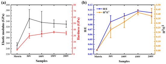 The hardness and elastic modulus of the AlCrNbSiTiN coatings are shown in Figure 5a. The elastic modulus decreases consistently from 349.7 GPa to 329.7 GPa as the bias increases from 50 V to 200 V, while the hardness of the coatings initially increases from 29.76 GPa to 35.8 GPa and slightly decreases to 34.37 GPa at a 200 V bias voltage. The coatings exhibit finest hardness of 35.8 GPa, which precede many reported coatings [27,44,45]. At low bias voltages, the structure of the coatings is relatively loose with noticeable particle defects, resulting in low hardness. At high bias voltages, the coatings become denser with a refined grain structure, leading to the improved hardness of the coatings. When the bias voltages increase from 50 V to 150 V, the result of H/E increases from 0.0856 to 0.1078, and the result of H3/E2 also increases from 0.2275 to 0.4166 GPa, respectively. Nevertheless, the H/E and H3/E2 results decrease to 0.1043 and 0.3794 GPa at a 200 V bias, respectively. The coatings prepared at a 150 V bias voltage are considered to exhibit optimal hardness and toughness.