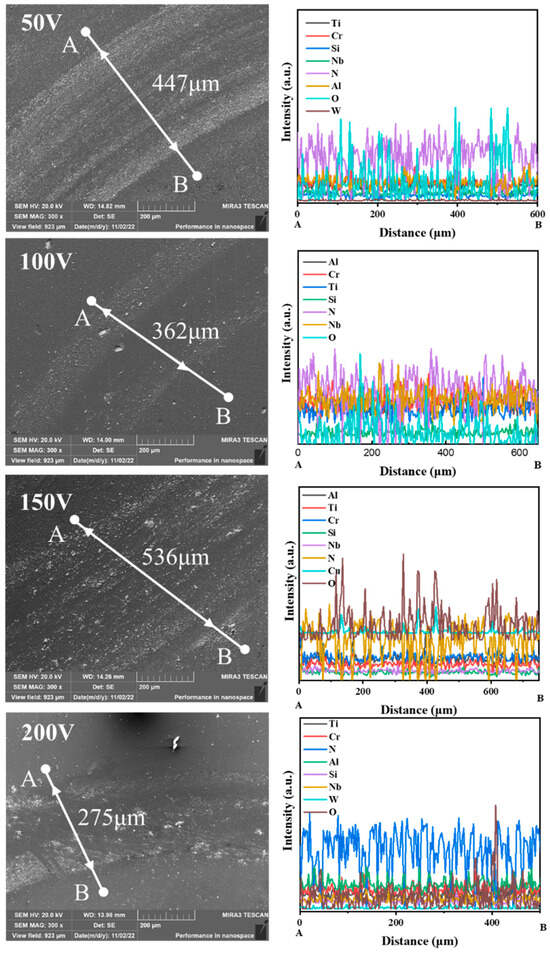 The wear scar morphology and EDS results of the AlCrNbSiTiN coatings are shown in Figure 6. No substrate elements could be identified, indicating that the protection of the coatings has not failed. The white phase on the surface of the abrasion is oxide. At a 50 V bias voltage, the grinding mark surface is covered with oxides (the white phase). It can be seen that the proportion of O increases significantly in the scratched surface. When the bias reaches 100 V, the oxides cannot completely cover the abrasion mark. For samples at a 150 V bias, a local increase in the proportion of Cu is detected on the surface of the wear marks, which is due to the adhesive wear caused by the Cu-Zn alloy grinding ball. The wear width of the coatings at a 200 V bias voltage is at its smallest at 275 μm.