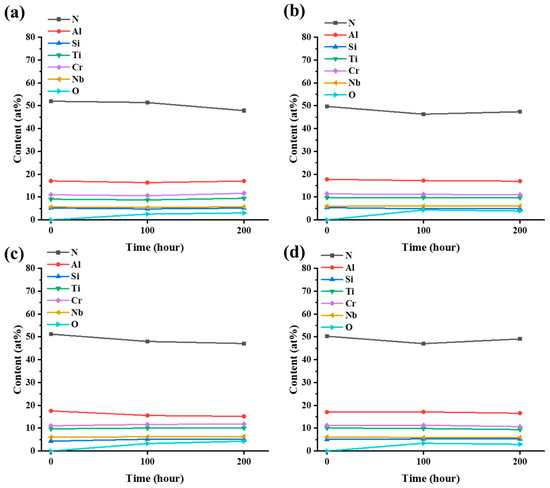 Variation of elemental proportions after water vapor corrosion of AlCrNbSiTiN coatings. (a) 50 V, (b) 100 V, (c) 150 V, (d) 200 V.
