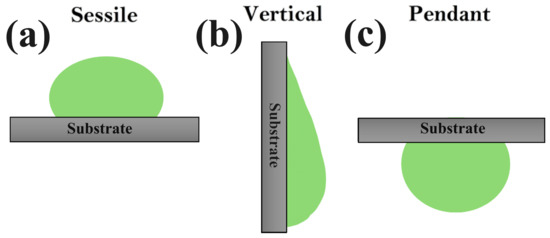 Three drying configurations: (a) sessile droplets (on a horizontal surface), (b) vertical droplets (on an inclined surface), and (c) pendant droplets (suspended downward).
