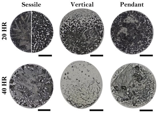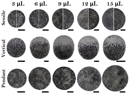 - Li, W.; Ji, W.; Sun, H.; Lan, D.; Wang, Y. Pattern formation in drying sessile and pendant droplet: Interactions of gravity settling, interface shrinkage, and capillary flow. Langmuir 2018, 35, 113–119. [Google Scholar] [CrossRef] [PubMed]