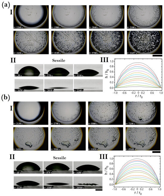 Pattern formation and drying process of sessile fertilizer droplets at 20% (a) and 40% (b) relative humidity. (I) Sequence of optical images showing the evolution of droplet patterns over time. Initial stages exhibit a smooth appearance (t = 1260–1980 s for 20% RH and t = 2130–2790 s for 40% RH), followed by the onset of crystallization (t = 2040–2100 s for 20% RH and t = 5580–7230 s for 40% RH), and culminating in complex, fibrous structures (t = 11,657 s for 20% RH and t = 45,680 s for 40% RH). (II) Side view images illustrating the lateral drying process, showing changes in droplet profile from a high and symmetrical shape to an extended, thin profile (t = 30–2340 s for 20% RH and t = 60–28,500 s for 40% RH). (III) Normalized height profiles ( versus normalized radius ( during the drying process, indicating the progressive flattening and extension of the droplet profile, and reflecting uniform and controlled evaporation dynamics. Scale bars indicate 1 mm.