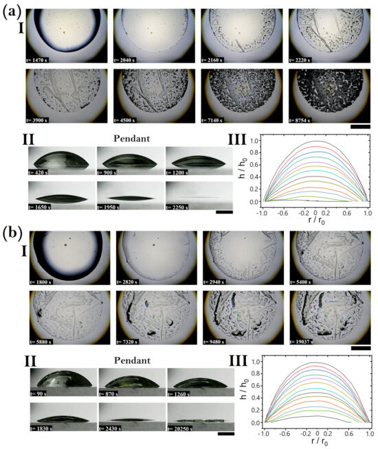 Pattern formation and drying process of pendant fertilizer droplets at 20% (a) and 40% (b) relative humidity. (I) Sequence of optical images showing the evolution of droplet patterns over time. Early stages exhibit a nearly circular shape and homogeneous solute distribution (t = 1470–2040 s for 20% RH and t = 1800–2940 s for 40% RH), followed by nucleation and aggregate formation (t = 2160–4500 s for 20% RH and t = 5400–7320 s for 40% RH), and culminating in complex crystalline structures (t = 7140–8754 s for 20% RH and t = 9480–19,037 s for 40% RH). (II) Side view images illustrating the lateral drying process, showing changes in droplet profile from hemispherical to extended thin deposits (t = 420–2250 s for 20% RH and t = 90–20,250 s for 40% RH). (III) Normalized height profiles ( versus normalized radius () during the drying process, indicating progressive flattening and extension of the droplet profile, reflecting uniform and controlled evaporation dynamics. Scale bars indicate 1 mm.