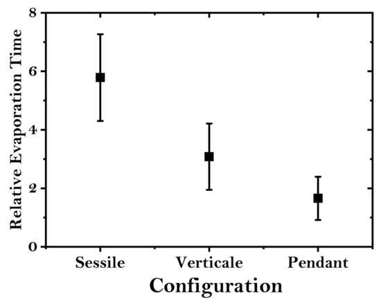 Figure 7 shows the relative evaporation time for each evaporation configuration. We observe that the sessile configuration has the highest relative evaporation time, with an average value close to 5.8, followed by the vertical configuration with an average around 3, and finally, the pendant configuration shows the lowest relative evaporation time, with an average close to 1.6. The sessile configuration might be more sensitive to relative humidity due to the air boundary layer that forms around the droplet. This boundary layer acts as a barrier to the diffusion of water vapor, and its effectiveness is directly related to the relative humidity of the surrounding air. The higher the relative humidity, the more saturated the air is with water vapor, and the less efficient the diffusion of vapor from the droplet into the air. In contrast, in the pendant configuration, the boundary layer is thinner and constantly disturbed by the airflow around the droplet. This is because the droplet is more exposed to air on all sides and is in less contact with a solid surface. The constant disturbance of the boundary layer facilitates the renewal of air in contact with the droplet’s surface, which means that water vapor is removed more quickly and replaced by drier air. This makes the evaporation process less dependent on the ambient relative humidity since even if the air is more saturated, the dynamic boundary layer allows for efficient diffusion of water vapor into the environment.