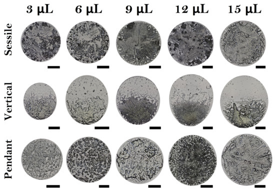 Figure 8 illustrates the effect of initial droplet volume on the drying patterns of fertilizer droplets at 20% relative humidity (RH) across three different configurations: sessile, vertical, and pendant. In the sessile configuration, droplets with volumes of 3 μL, 6 μL, 9 μL, 12 μL, and 15 μL exhibit consistent morphological characteristics. Each pair of images for these volumes shows patterns that include elongated crystalline structures and fibrous regions. The left half of each image typically displays elongated crystalline structures, while the right half shows a more fibrous pattern. In this configuration, two different types of patterns prevail regardless of the volume. For the vertical configuration, the drying patterns also remain consistent across the range of volumes. The images reveal a gradient of crystal density from the top to the bottom of the droplet, reflecting the influence of gravity on solute distribution during evaporation. As the volume increases, the shape factor, defined as the ratio of the droplet height to its base diameter, also increases. This shape factor reaches a maximum value of = 1.2 in 15 μL droplets and a minimum value of = 1 in 3 μL drops. This change suggests that gravity significantly impacts the drying dynamics, causing more pronounced solute movement and aggregation in larger droplets. In the pendant configuration, the patterns again show consistent morphological characteristics across different volumes. The images reveal that the fibrous structures are prominently present, with larger droplets exhibiting more extensive and interconnected crystalline networks. The uniformity in pattern formation despite varying volumes indicates a robust drying process influenced by the pendant configuration.