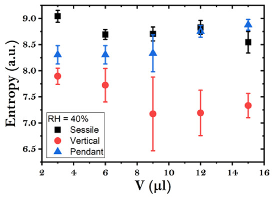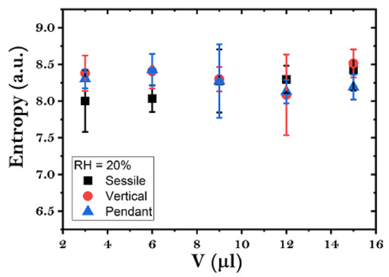 Entropy values of dried fertilizer droplets over a range of initial drop volumes (3 μL to 15 μL) in three configurations (sessile, vertical, and pendant) at 20% relative humidity (RH). Regardless of the initial droplet volume and configuration, the entropy values remain relatively constant, suggesting consistent heterogeneity in the mass distribution of the deposits. The error bars are the standard deviation with n = 20.