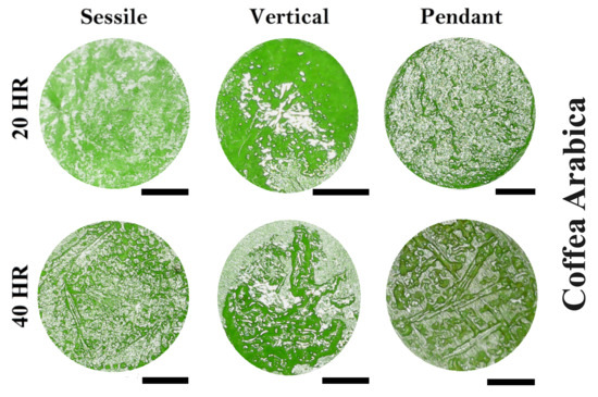 - Mampallil, D.; Eral, H.B. A review on suppression and utilization of the coffee-ring effect. Adv. Colloid Interface Sci. 2018, 252, 38–54. [Google Scholar] [CrossRef]