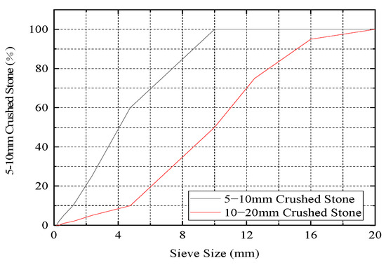 Coarse aggregate is sourced from Gele Mountain Quarry. The composition of the coarse aggregate consists of 5–10 mm crushed stones and 10–20 mm crushed stones mixed in a 3:7 ratio. The main properties of the crushed stones are shown in Table 3. The grain size distribution curve in Figure 1 illustrates the particle size distribution of two different ranges of crushed stones: 5–10 mm and 10–20 mm.