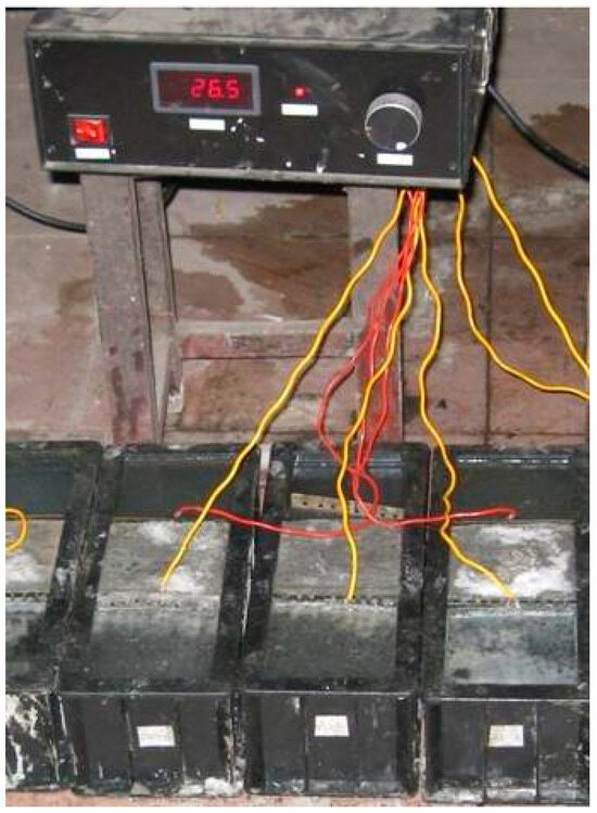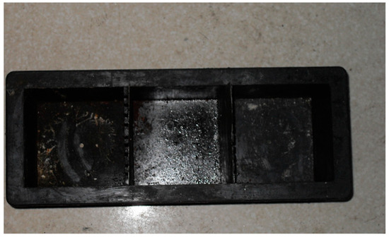 - The mold of the water group and sulfate solution is a laboratory plastic triple mold, specification 100 mm × 100 mm; after the improvement of the standard triple mold, it becomes the mold used for the electro-osmotic pulse group specimen. The middle baffle is sawed into a comb shape, the seam depth is about 90 mm, the seam width is 2~3 mm, and 9 seams are evenly sawed on each plate (Figure 1).