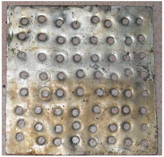 - The white iron sheet, specification 100 mm × 120 mm, is mainly used for the test group to prevent cement slurry seepage during concrete molding; the perforated white iron sheet (Figure 2), 95 mm × 100 mm, is used as the electrode plate.