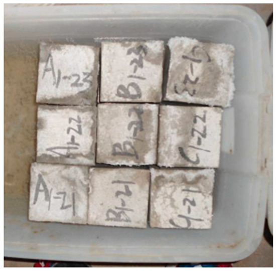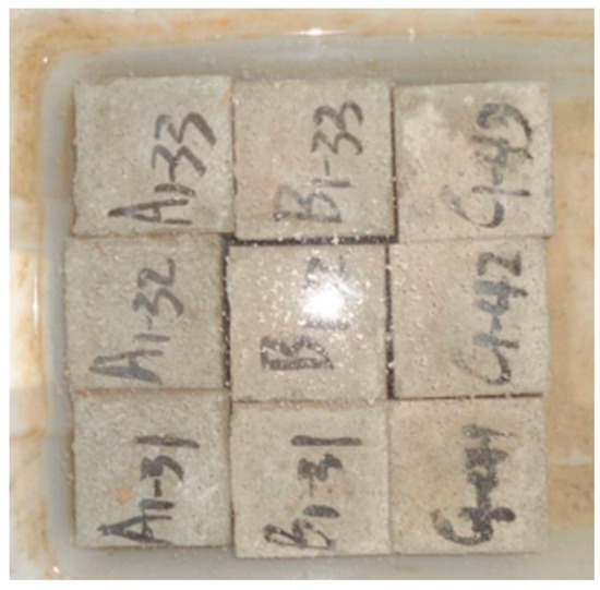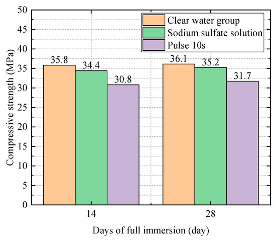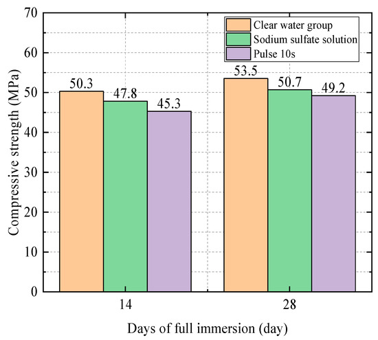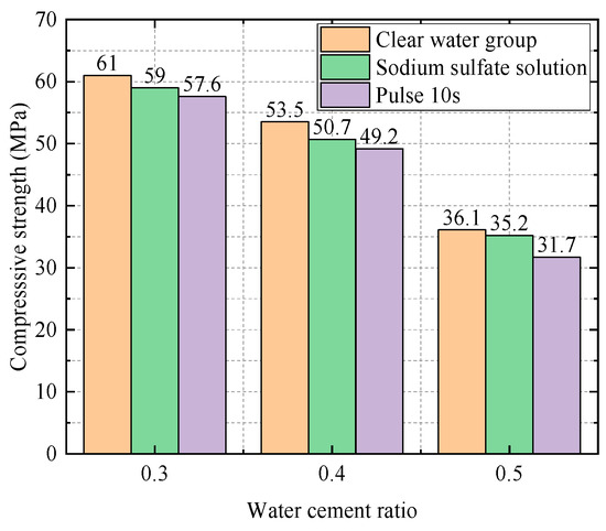 Concrete specimens were molded at three different water–cement ratios: 0.3, 0.4, and 0.5. This experiment uses these water-to-cement ratios based on actual concrete in common engineering projects and referencing the standards of the ‘Concrete Design Code’ (GB/T 50081-2019) [34]. The selection of water-to-cement ratios aims to study the impact of different densities on sulfate attack. Both the electric field group and the sodium sulfate solution group used the same concentration of sodium sulfate solution. The specimen with a water–cement ratio of 0.4 uses 10 s and 20 s frequencies to compare the influence of the electric field frequency. Each mix proportion had three groups, with three samples in each group, totaling 9 samples. The preparation and testing of the samples in this experiment were carried out by the Standard Test Methods for Long-Term Performance and Durability of Ordinary Concrete (GB/T 50082-2009) [35]. Each method involved molding three specimens, and the compressive strength was calculated as the average of the three specimens. The specimens were molded according to standard curing conditions and tested for compressive strength after specific immersion periods. To ensure consistency and minimize external influences, three specimens were molded for each method, and the compressive strength was calculated as the average of the three specimens.