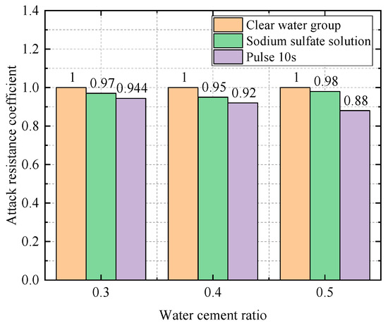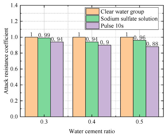 Figure 10 and Figure 11 illustrate that as the water–cement ratio goes from 0.3 to 0.5, the attack resistance coefficient follows the trend: water group > test group > test group, indicating a clear decrease in the compressive strength of concrete under the action of the electric field. However, there is some fluctuation in the relative attack resistance coefficient with the change in water–cement ratio. This result may be attributed to three reasons: (1) the introduction of the electric field in the sodium sulfate attack test accelerates the attack of concrete by sodium sulfate; (2) the attack and damage of concrete by sodium sulfate is a complex physicochemical process; (3) the attack time of sodium sulfate on concrete is relatively short, and the strength development of concrete has not yet reached a stable state, resulting in the phenomenon presented in the figure.