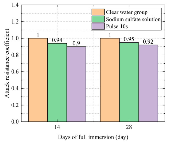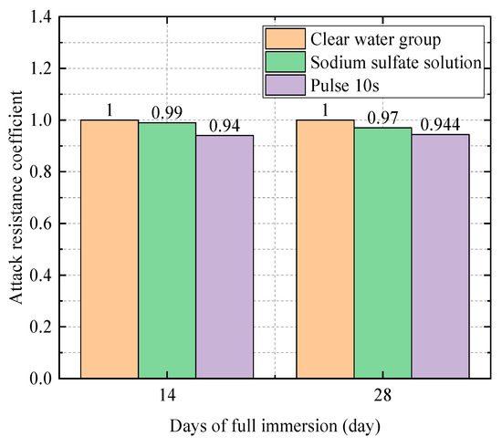 Figure 22 and Figure 23 show that in the sodium sulfate solution group the attack resistance coefficients at 14 and 28 days are 0.96 and 0.98, respectively. In the electric field group, the attack resistance coefficients at 14 and 28 days are 0.88 and 0.88, respectively. This indicates that there is little change in the attack resistance coefficient with increasing time.
