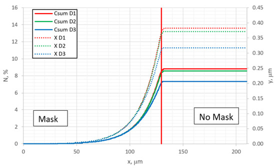 Figure 3b,c show the influence of diffusivity on the concertation and topographical profiles. Interesting and important curves are in the transition region at the edge of the mask. Despite the covered surface area under the mask, nitrogen penetration occurs because of two processes: lateral diffusion and undermask adsorption. In this case, the undermask adsorption is included into simulations, as it can occur if the mask is not well adhered to the surface and gas molecules can penetrate under the mask. The experimental conditions [