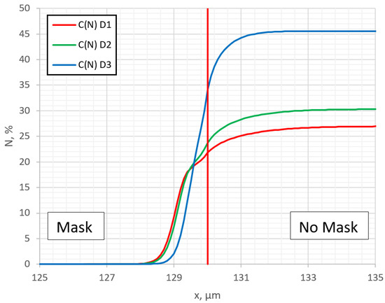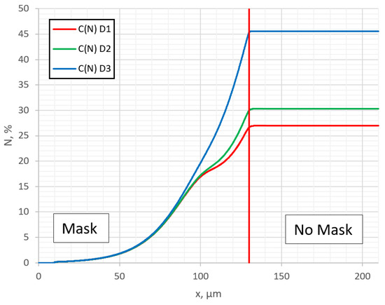Figure 5), a step in the curve of surface nitrogen concentration is observed, and the reason for this step is the same, i.e., there is significant influence of the nitrogen-trapping process. To confirm this assumption, the profiles of the surface concentration of nitrogen species