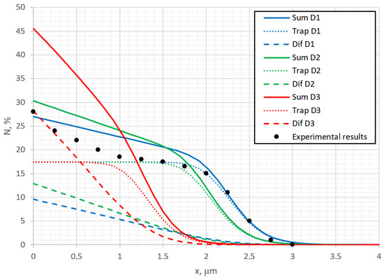 Figure 7 shows that the distribution of nitrogen concentration is highly dependent on the diffusion coefficient: at low diffusivity, the depth distribution of nitrogen resembles a sloping incline, while at higher diffusivity, nitrogen penetrates into deeper layers faster and the nitrogen profile acquires the shape of a plateau, the edge of which strongly depends on the nitrogen in the trap or the amount of chromium in the alloy. Note that level of trapped nitrogen does not change with diffusivity and only shifts deeper into the bulk of the sample.