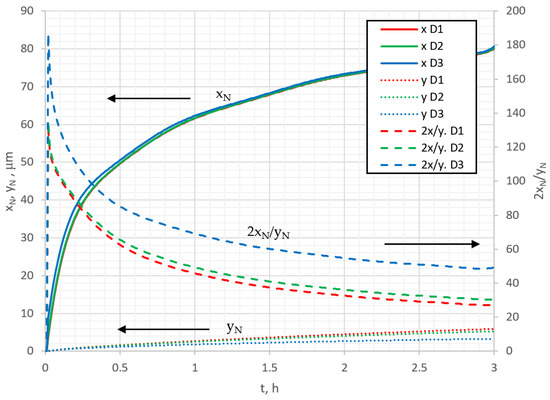 Figure 8, the aspect ratio of nitriding is shown as function of time and diffusion rate. It can be noticed that the aspect ratio decreases over nitriding time, approaching a steady state value, and depends on the diffusion coefficient; with a decrease in the diffusion coefficient, the aspect ratio increases. This phenomenon is influenced by the fact that the concentration changes near the surface more significantly compared with the deeper layers, and as the diffusion coefficient decreases, it increases the surface concentration and the aspect ratio as well. The dependence of the aspect ratio on the time and the diffusion rate means that the nitriding process has an anisotropic character.