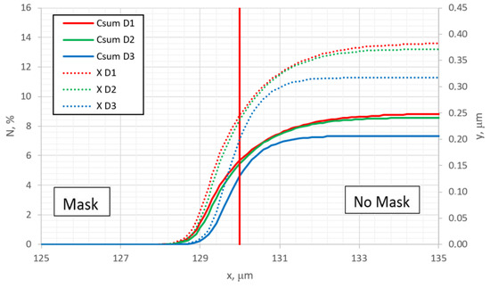 Figure 7; however, this is true only in the regions relatively far from the edges of the mask. Considering the edge regions of the mask, the topographic profiles in those two cases differ, and the depth distribution of nitrogen differs as well.