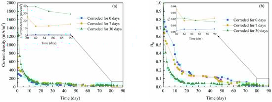 Different from the other two groups, the current density of the samples corroded for 30 days at the beginning of polarization reached 1800 mA/m2, which is much larger than that of the samples corroded for 0 days and 7 days. After that, the trend of the current density curve is basically the same as that of the other two groups; it also decreases with a steep slope in the first 10 days and the decreasing speed gradually slows down in 10–20 days. After 20 days, the curve changes in a small range, and the value finally drops to about 30 mA/m2.