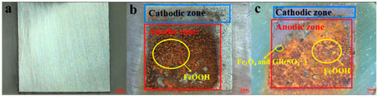 Photograph of samples immersed in corrosion solution for 0 days, (a) 7 days, (b) and 30 days (c) after 90 days of the cathodic protection experiment.