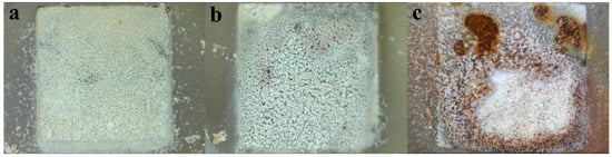 Figure 3 shows images of the three groups of samples after 90 days of cathodic protection. The calcium–magnesium deposition layer formed on the surface of the metal without corrosion is the densest. However, the density of the calcium–magnesium deposition layer on the surface of the 7-day corrosion sample is poor. Black metal substrate and a yellow rust layer can even be seen. The samples of the 30-day corrosion group have the worst degree of protection, with large pieces of the rust layer falling off. After the rust layer falls off, the exposed metal surface has locally excessive cathodic protection current density. Therefore, the OH− concentration is higher in those areas, which can lead to the formation of a relatively good calcium–magnesium deposition layer. However, this may make it difficult for other areas to meet the conditions for deposition. Consequently, the calcium–magnesium deposition layer formed on the surface of the rust layer is very rare. Therefore, the magnitude of the current density in the last 10 days in Figure 1 is consistent with the macroscopic appearance.