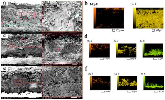The cross-sectional SEM images of the specimens after 90 days of cathodic protection with 0 days of corrosion, (a,b) 7 days, (c,d) and 30 days (e,f), and the corresponding distribution maps of Ca and Mg elements in the cross-sections (b,d,f).