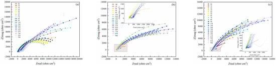 The Nyquist plots of the specimens after 90 days of cathodic protection with 0 days of corrosion, (a) 7 days, (b) and 30 days (c).