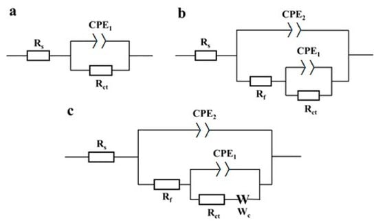 The equivalent circuit diagram for AC impedance fitting, (a) one time constant, (b) two time constants, (c) applied diffusion tail.