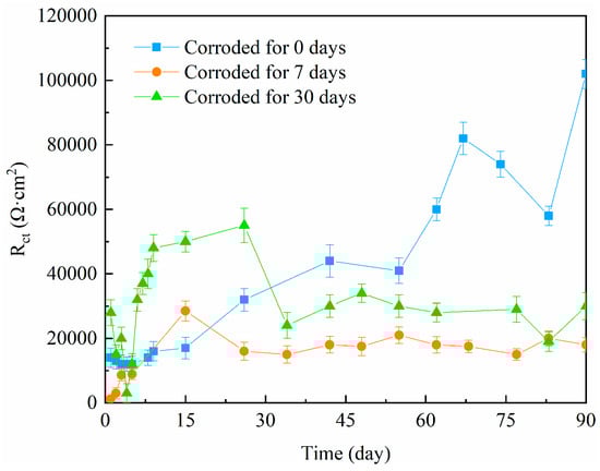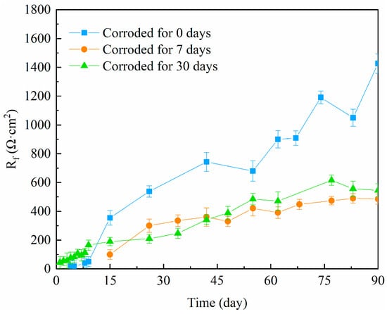 The analysis of equivalent circuit components in different corrosion states, as shown in Figure 7 and Figure 8, indicates that with the passage of time, both the resistance Rf of the calcium deposition layer and the charge transfer resistance Rct exhibit an overall increasing trend. Additionally, in all three corrosion states, the Rf and Rct values of the samples in the 0-day corrosion group are the highest, while the difference between the Rf and Rct values of the samples in the 7-day corrosion group and the 30-day rust group is not significant. The presence of rust facilitates the nucleation and growth of a calcium deposition layer on its surface. As the deposition layer gradually fills the pores in the rust layer, it becomes increasingly challenging for ions to diffuse into the interior of the rust layer for further deposition. Moreover, the density of the rust layer itself cannot compare to that of the calcium deposition layer, resulting in inferior metal protection. Consequently, there is a gradual increase in resistance values for both the 7-day and 30-day rust groups.