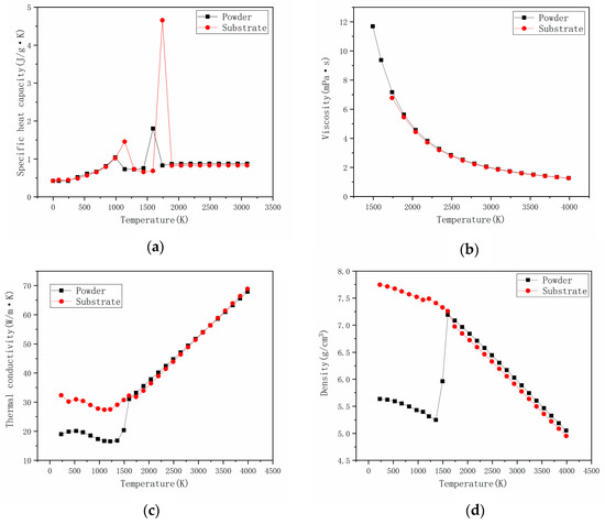 The thermophysical properties of powder and substrate: (a) specific heat capacity, (b) viscosity, (c) thermal conductivity, (d) density.