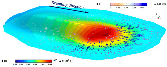 It can be observed from Figure 3 that the flow direction of the molten pool is centered around the direct position of the light source, which is caused by the Marangoni effect of the surface-tension difference generated by the temperature gradient. At the higher temperature, due to the higher heat, the internal energy of liquid molecules increases, and the diffusion effect is enhanced significantly upon the liquid surface, resulting in the decrease in the number of molecules per unit volume and the increase in molecular spacing, as well as the decrease in the total gravitational attraction between molecules per unit volume and the decrease in surface tension. At the lower temperature, due to the lower heat, the internal energy of liquid molecules also increases, but the diffusion effect is enhanced non-significantly; consequently, it is less obvious than at the higher temperature that there is a decrease in the number of molecules per unit volume and an increase in molecular spacing, as well as a decrease in the total gravitational attraction between molecules per unit volume and a decrease in surface tension. Since the liquid flows to the surface tension where the surface-tension value is low, it can be seen that the flow direction is centered on the direct position of the light source and points around it.